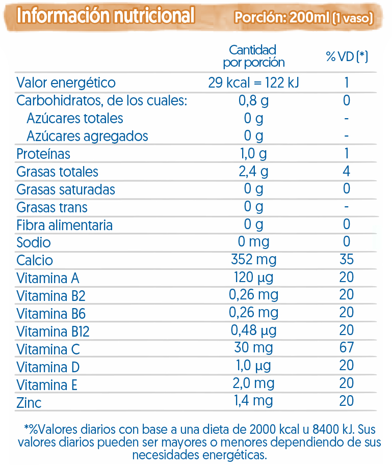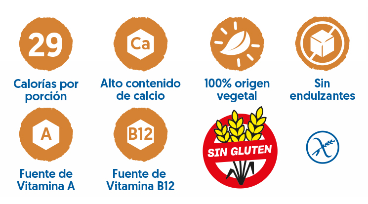 • Esta bebida no contiene AZÚCARES y aporta 35% DE CALCIO Y VITAMINAS A, B2, B6, B12, C, D Y E.