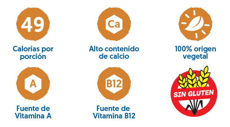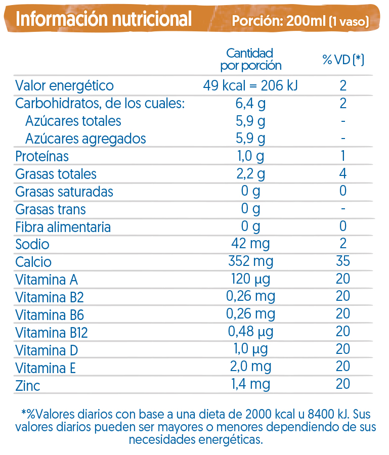 • Esta bebida aporta 35% DE CALCIO por porción y VITAMINAS A, B2, B6, B12, D Y E.